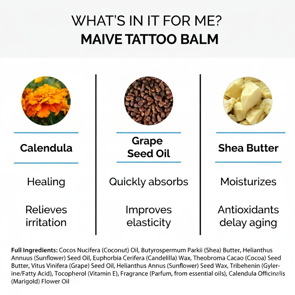Cocoa Butter — Seals in moisture and enhances the natural sheen of tattooed skin.